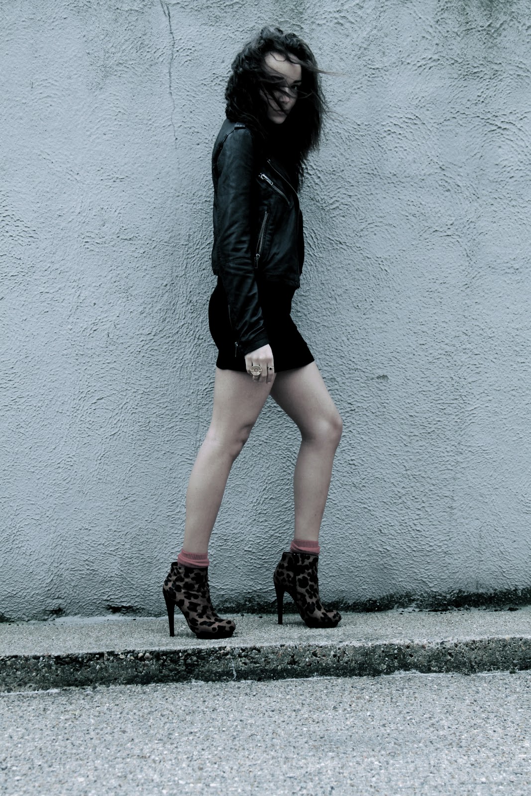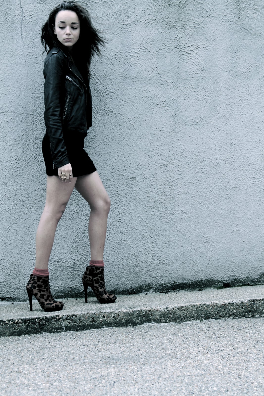 Dress & Leather Jacket: TopShop. Leopard Boots: ASOS.