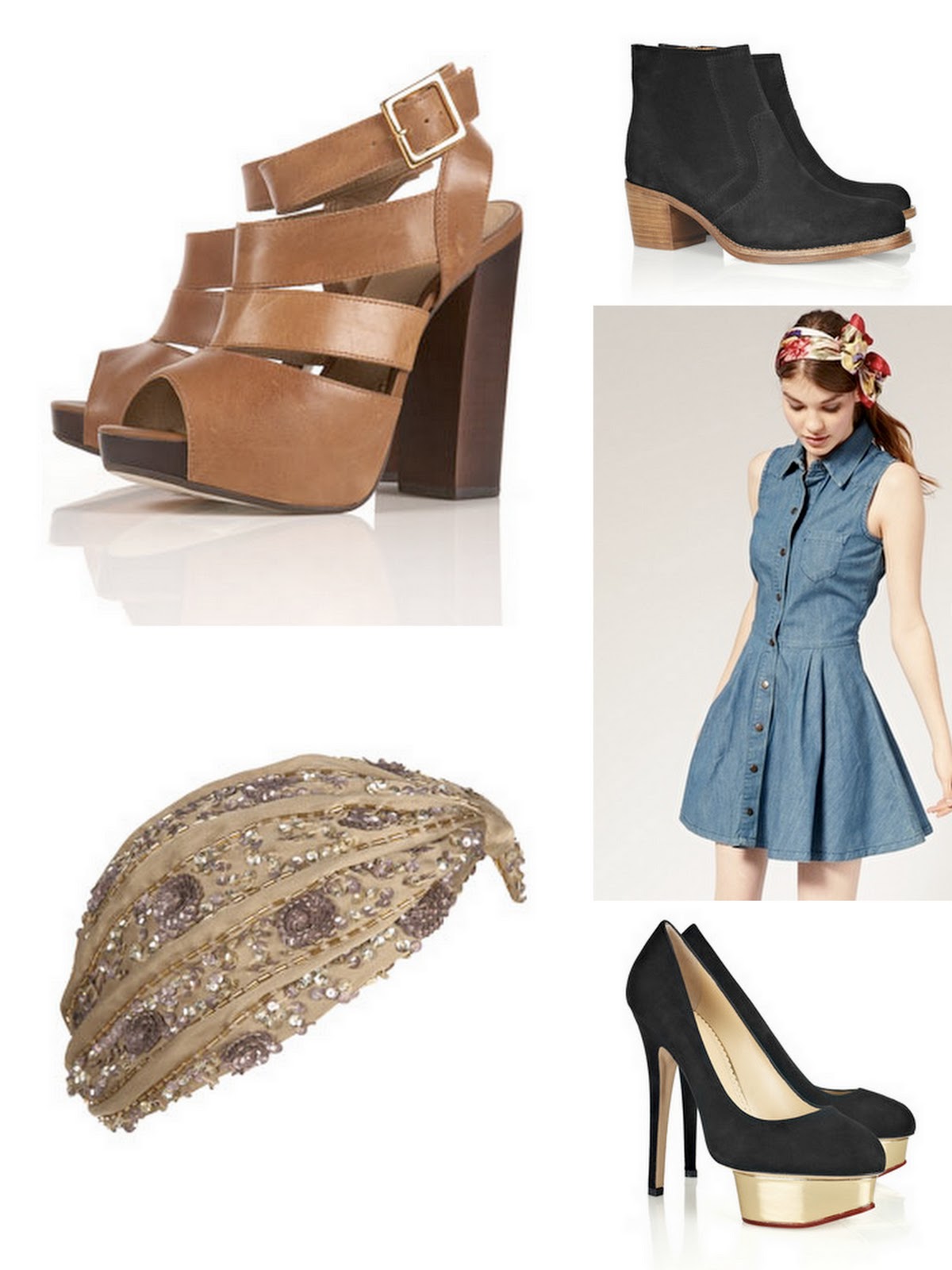 Clockwise from top: ‘Livia’ Platform Sandals £75: TopShop. Suede ankle boots £335: APC via Net-a-Porter. Full Skirt Denim Dress £40: ASOS. ‘Dolly’ Suede platform pumps £595: Charlotte Olympia via Net-a-Porter. Bronze embellished turban £22: TopShop