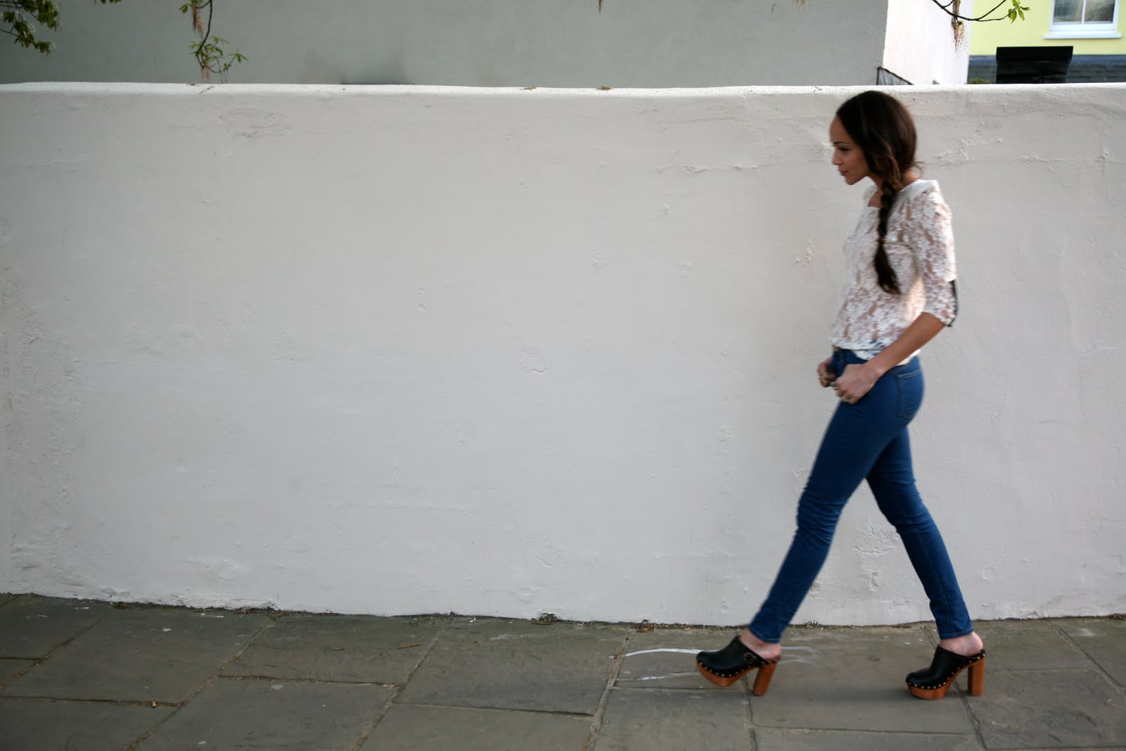 Lace top. cropped bra (worn underneath) and jeans: TopShop. Clogs: Jeffery Campbell