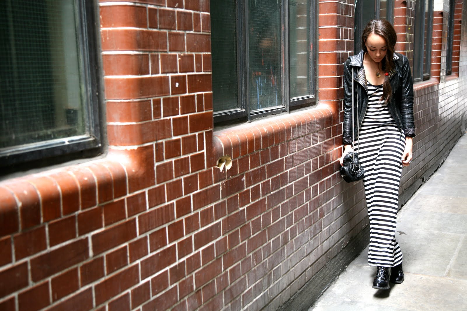 Maxi Dress: Miss Selfridges. Leather Jacket: TopShop DIY studded. Bag: Alexander Wang. Boots: TopShop