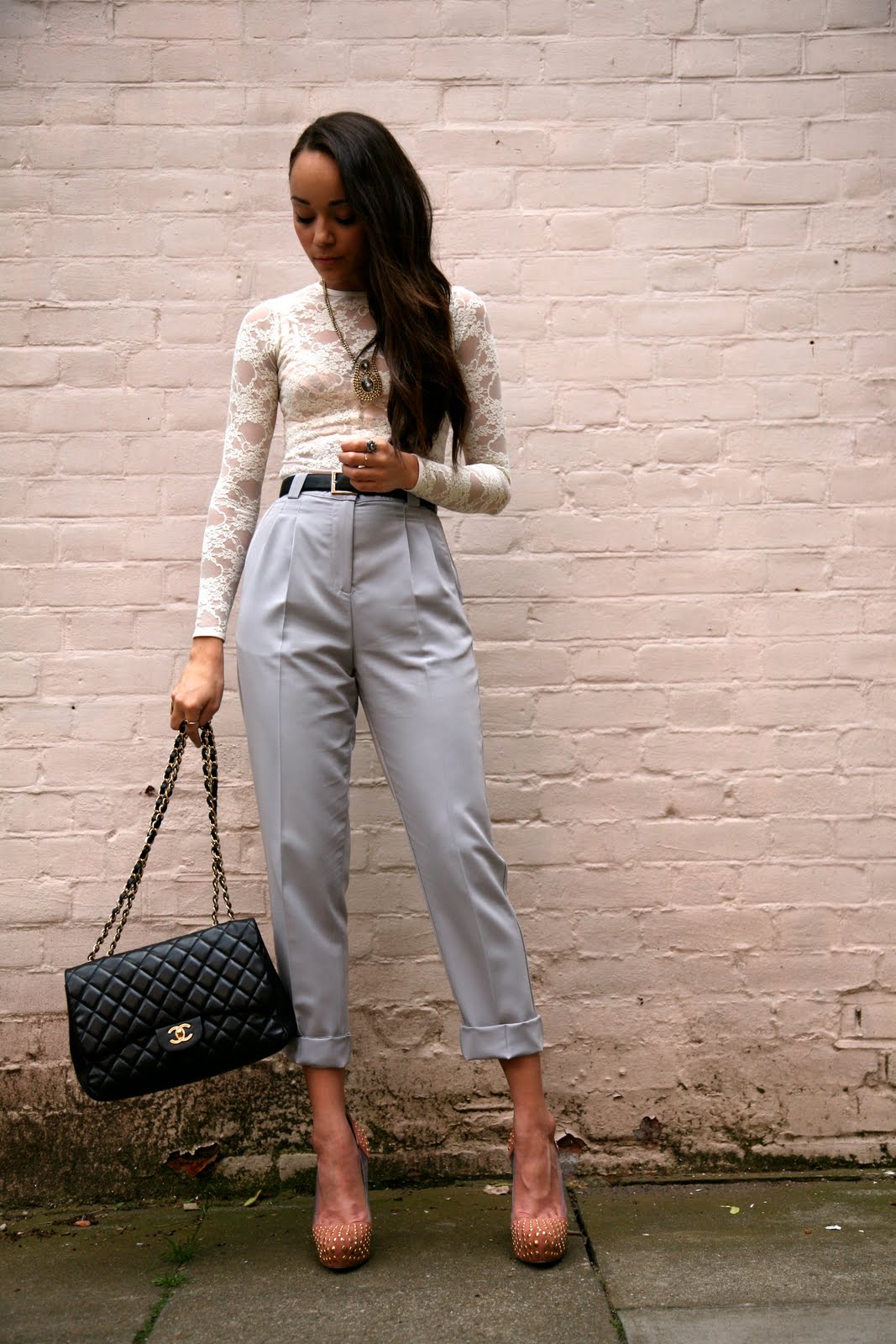 love that look. the heels are to die for (litterally, right?). I also like the boyish trousers and the very sexy, very feminin lace top..