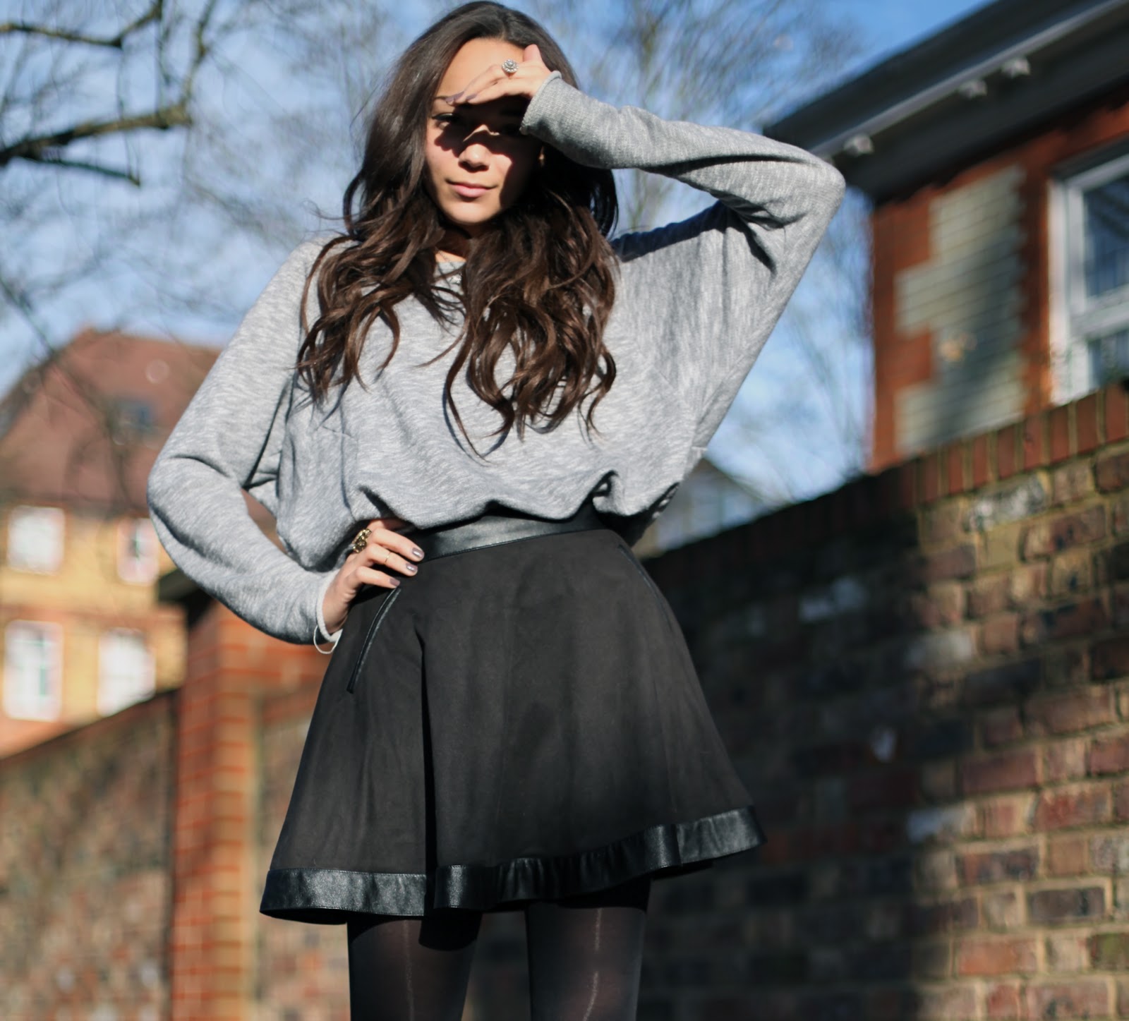 Skirt: Courtesy of Warehouse. Sweatshirt: TopShop.